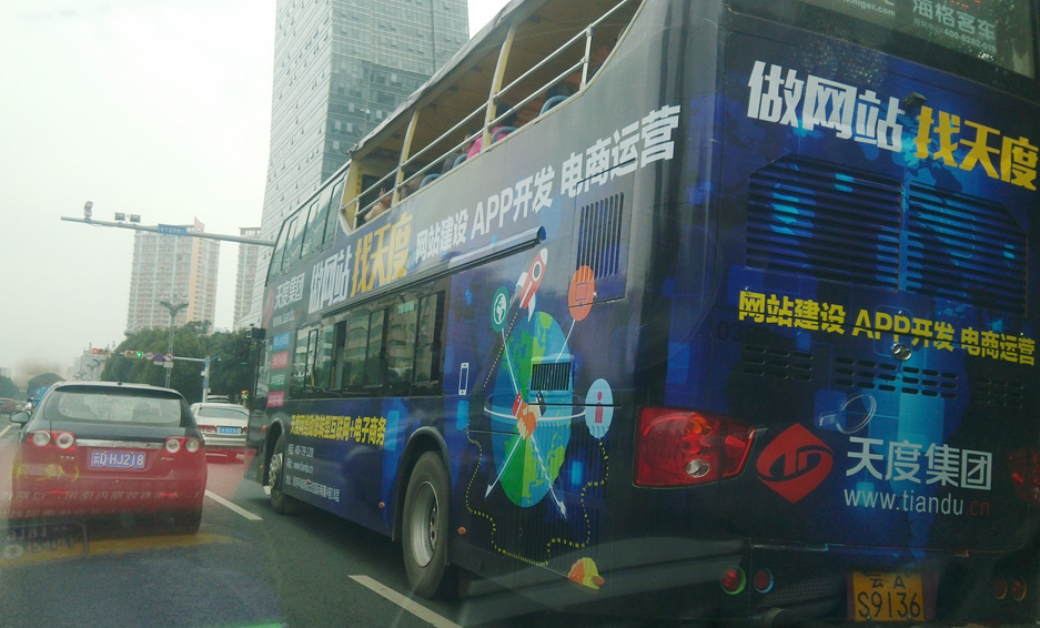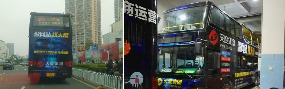 天度集團(tuán)投入巨資進(jìn)行了昆明全城廣告覆蓋,作為云南很具規(guī)模和品牌影響的互聯(lián)網(wǎng)企業(yè),天度為加強(qiáng)品牌影響力,陸續(xù)投入了昆明主要干線雙層大巴公交車車身廣告、車內(nèi)靠背廣告、公交車電視廣告、機(jī)場(chǎng)大巴雜志封面廣告、市區(qū)基地各大路牌燈箱廣告、電梯廣告、市基地戶外LED大屏廣告、新高速收費(fèi)站廣告、影院LED廣告、商圈燈箱廣告、樓宇燈箱廣告、KTV燈箱廣告、平面報(bào)刊廣告、網(wǎng)絡(luò)廣告等。相信本輪廣告的投放,將加大云南企業(yè)家對(duì)互聯(lián)網(wǎng)轉(zhuǎn)型的認(rèn)識(shí),并促進(jìn)天度公司的快速發(fā)展。