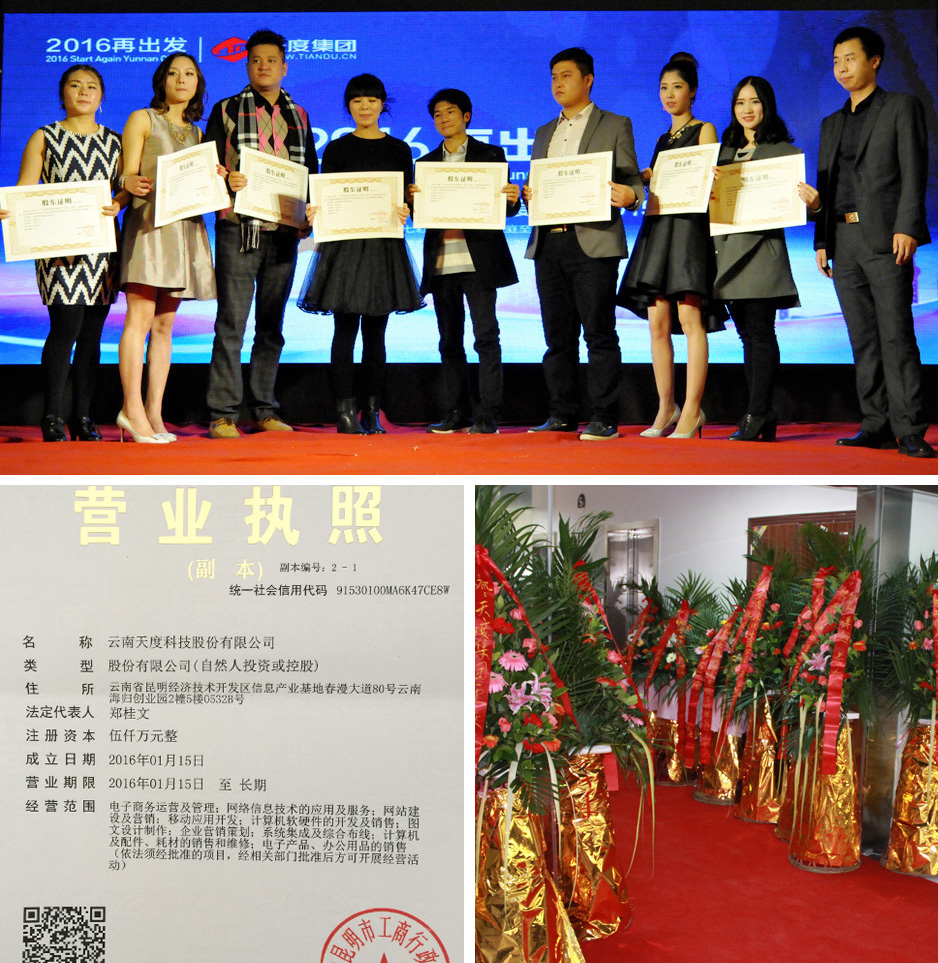 2016年1月28日,云南天度集團(tuán)董事長(zhǎng)鄭桂文向所有獲得股份獎(jiǎng)勵(lì)的員工頒發(fā)了《股權(quán)證書(shū)》,并將所有股東、董事、監(jiān)事提交到云南省工商行政管理局進(jìn)行了正式登記。
