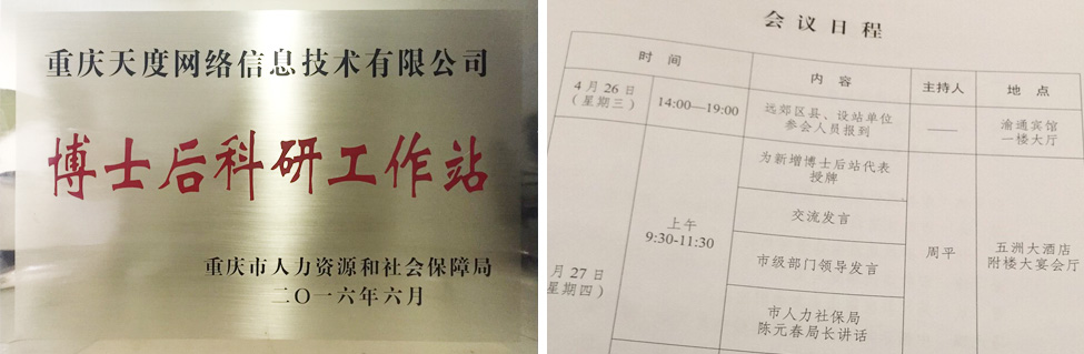 2017年4月27日,重慶市人力資源和社會(huì)保障局、重慶市博士后管理辦公室舉辦的“全市博士后工作會(huì)”在五洲大酒店召開(kāi),重慶市人社局陳元春局長(zhǎng)為“重慶天度網(wǎng)絡(luò)信息技術(shù)有限公司”等新增博士后站進(jìn)行了授牌。