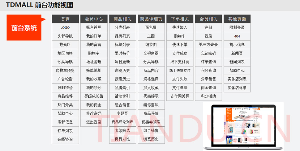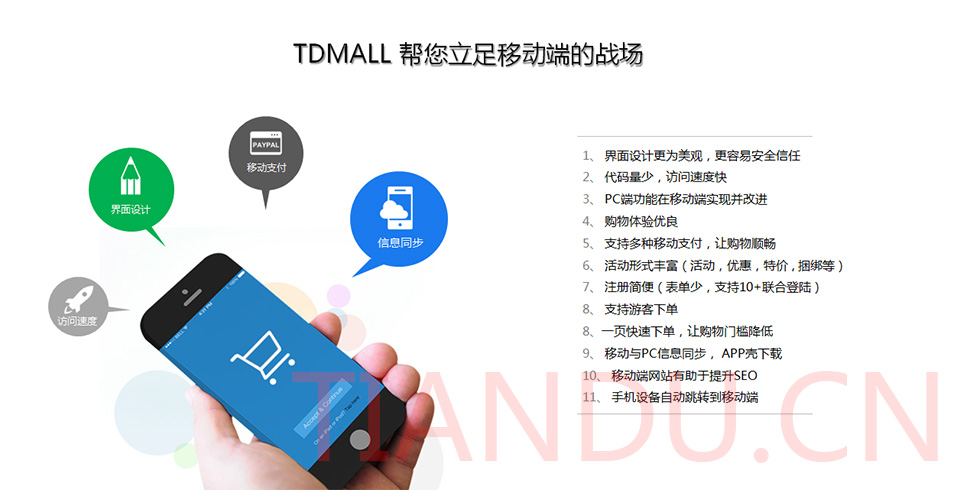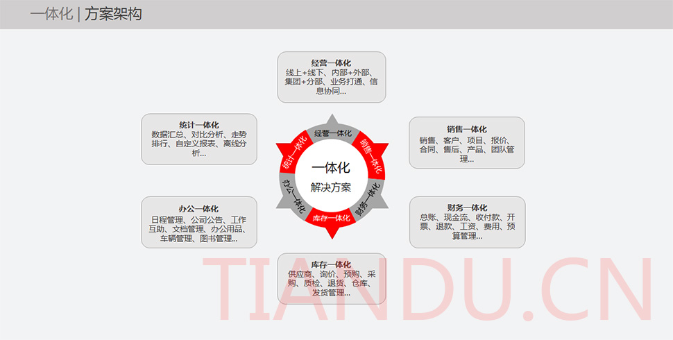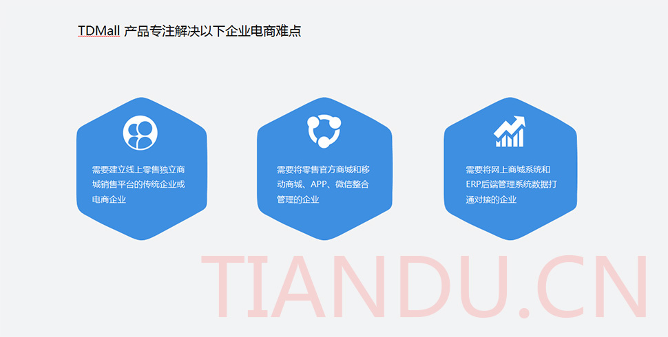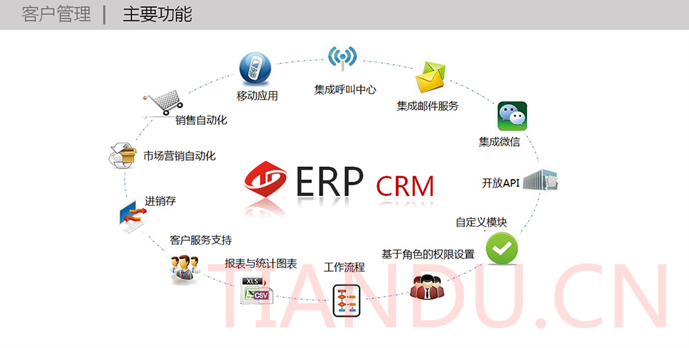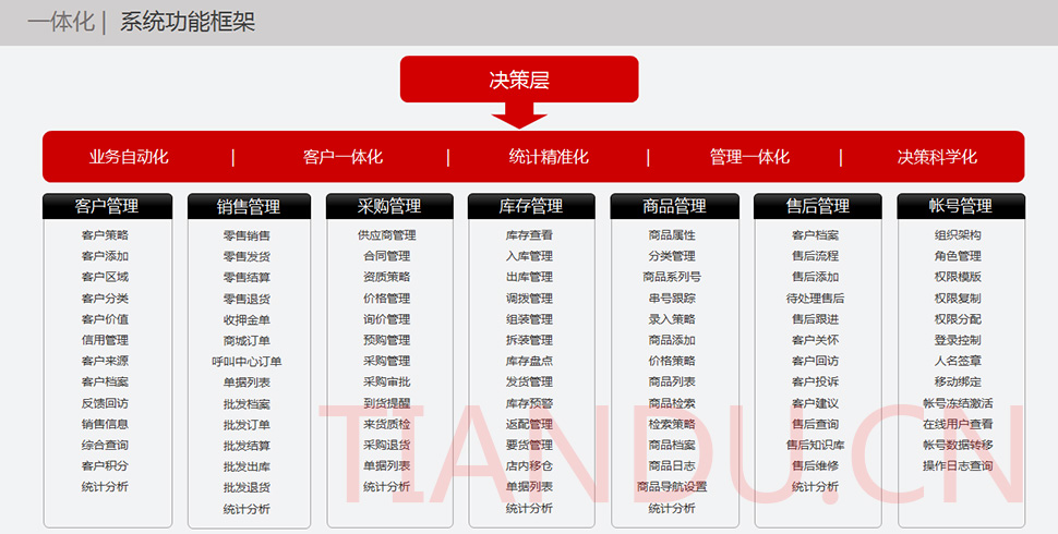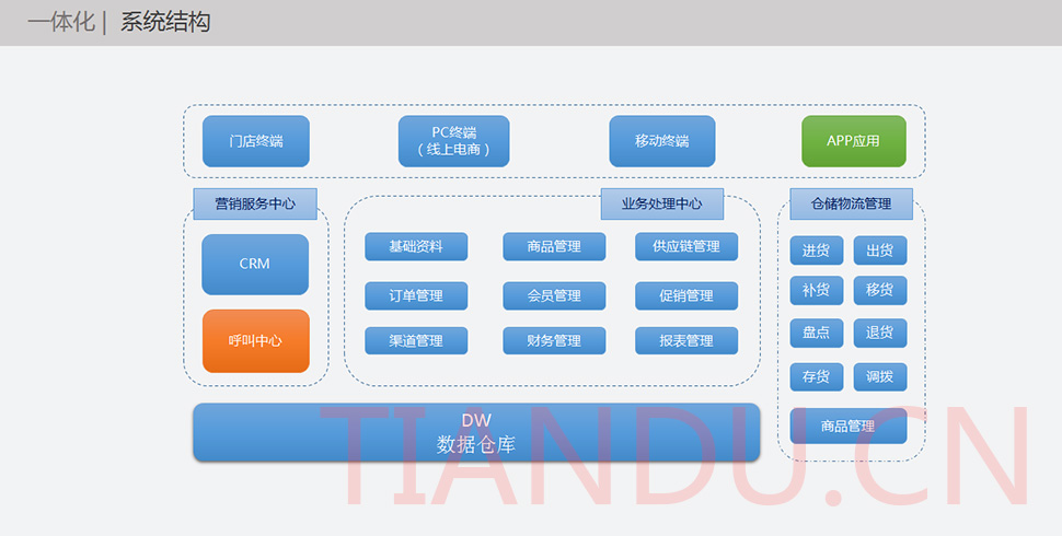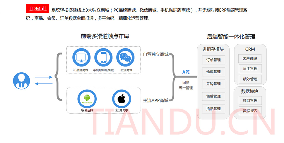 天度科技互聯(lián)研究院(博士后科研工作站)、天度軟件系統(tǒng)有限公司、天度科技股份有限公司合力近400人專業(yè)研發(fā)團(tuán)隊(duì),結(jié)合自身11年電子商務(wù)運(yùn)營經(jīng)驗(yàn),全力打造TDMALL電商ERP系統(tǒng):整合電商網(wǎng)站平臺(PC版、觸屏版、微信版、APP版)、ERP企業(yè)資源管理系統(tǒng)、CRM客戶關(guān)系管理系統(tǒng)、財(cái)務(wù)管理系統(tǒng)、OA辦公系統(tǒng)和Call Center呼叫中心等系統(tǒng),實(shí)現(xiàn)前端電商平臺及后端強(qiáng)大支撐系統(tǒng)的管理。