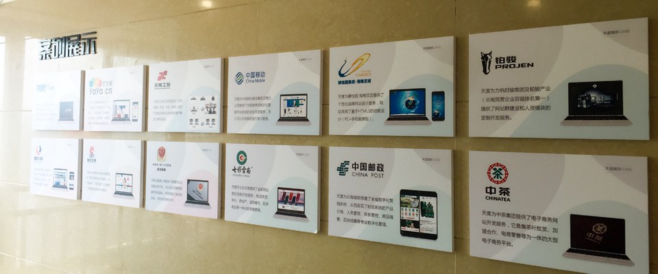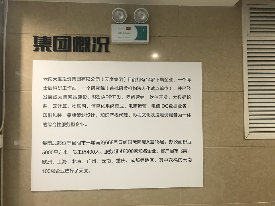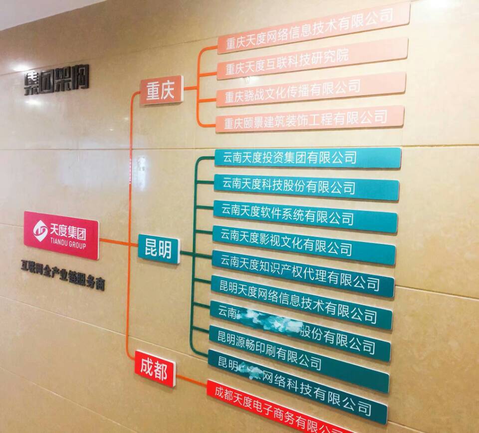集團概況的文化墻對面就是咱們天度更詳細(xì)的“集團架構(gòu)”,分別羅列出了重慶、昆明、成都三個總部的子公司,讓客戶對天度集團名下的子公司有更深入的認(rèn)識,也從正面證明了天度12年積累下來的傲人的成果。