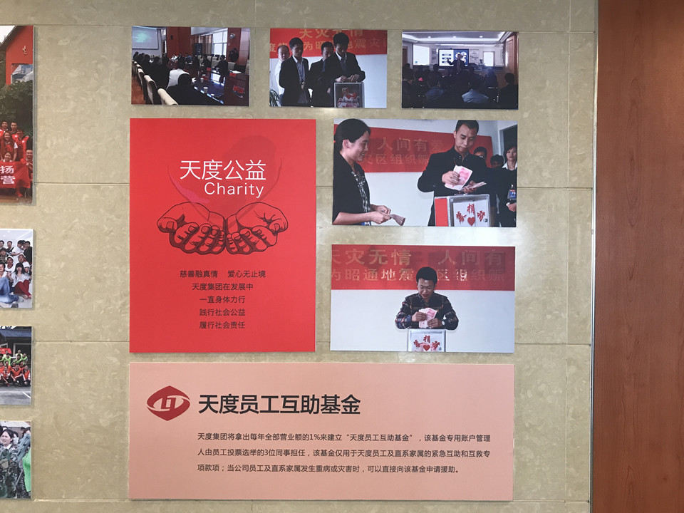 每一分榮譽證書的背后,都離不開為集團默默付出的員工。天度集團也珍視每一位員工,特別在集團內(nèi)部設(shè)立“天度公益”,一個只屬于天度員工的互助基金,賬戶管理由全體員工投票選出三位同事?lián)?,?dāng)公司員工及家屬發(fā)生重病或災(zāi)害時,可以直接向該基金申請救助!