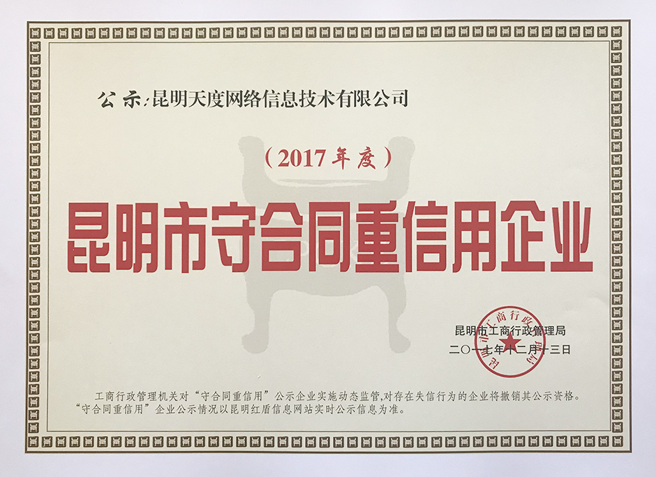 經(jīng)昆明市人民政府“守合同重信用”領導小組辦公室(昆明市工商行政管理局)組織推薦、昆明市人民政府“守合同重信用”領導小組成員單位聯(lián)合審查和通過媒體公示接受社會各界監(jiān)督等工作程序,已完成公示認定工作。熱烈祝賀昆明天度網(wǎng)絡信息技術有限公司被昆明市工商行政管理局評為2017年度“昆明市守合同重信用企業(yè)”。
