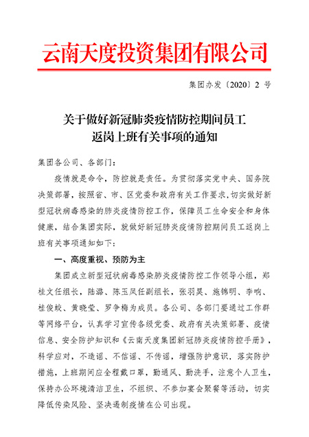 疫情就是命令,防控就是責(zé)任。為貫徹落實(shí)黨中央、國(guó)務(wù)院決策部署,按照省、市、區(qū)黨委和政府有關(guān)工作要求,切實(shí)做好新型冠狀病毒感染的肺炎疫情防控工作,保障員工生命安全和身體健康,集團(tuán)成立新型冠狀病毒感染肺炎疫情防控工作領(lǐng)導(dǎo)小組,并就做好新冠肺炎疫情防控期間員工返崗上班有關(guān)事項(xiàng)作出通知: