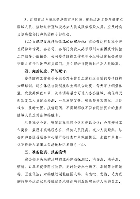 (二)出現(xiàn)突發(fā)或特殊情況的處理措施:在經(jīng)營(yíng)運(yùn)行過程中若發(fā)現(xiàn)異常情況,各公司、各部門負(fù)責(zé)人必須即刻向集團(tuán)疫情防控工作領(lǐng)導(dǎo)小組報(bào)告,公司疫情防控工作領(lǐng)導(dǎo)小組將迅速報(bào)告屬地街道辦事處和政府相關(guān)部門,并立即進(jìn)行現(xiàn)場(chǎng)封閉及人員隔離。