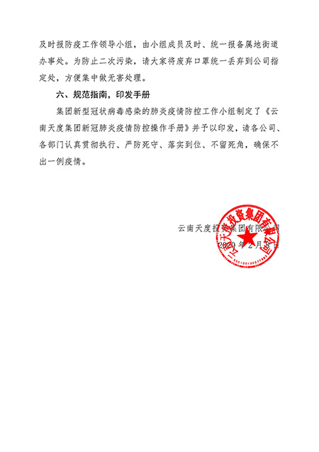 集團(tuán)新型冠狀病毒感染的肺炎疫情防控工作小組制定了《云南天度集團(tuán)新冠肺炎疫情防控操作手冊(cè)》并予以印發(fā),請(qǐng)各公司、各部門認(rèn)真貫徹執(zhí)行、嚴(yán)防死守、落實(shí)到位、不留死角,確保不出一例疫情。