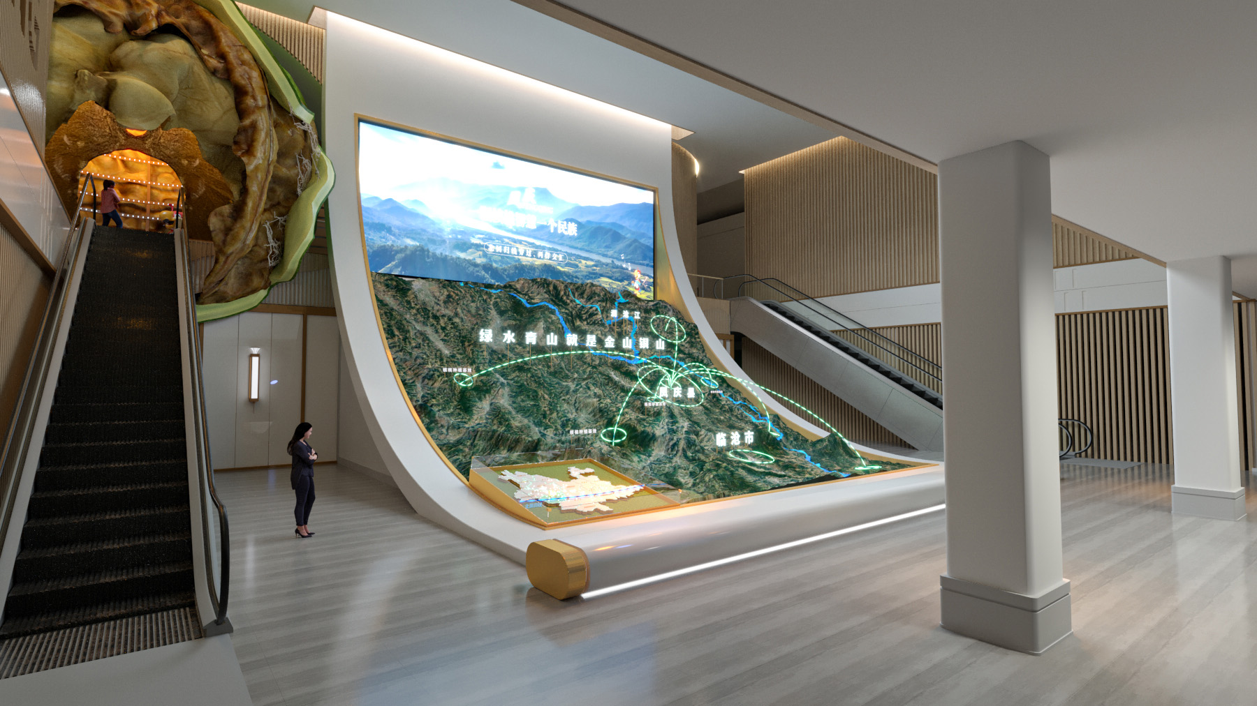 數(shù)字沙盤的運(yùn)用能夠?qū)⑵髽I(yè)的空間布局和發(fā)展規(guī)模都生動(dòng)形象的表現(xiàn)出來,能夠讓觀眾一目了然,展示效果直觀有震撼力。數(shù)字展廳要傳達(dá)什么內(nèi)容和信息,需要通過鮮明的主題來展示給觀眾,因此,在進(jìn)行展廳設(shè)計(jì)之前,必須對主題定位準(zhǔn)確,通過相應(yīng)的焦點(diǎn),再配合適當(dāng)?shù)纳?、圖標(biāo)與裝飾,以協(xié)調(diào)一致、突出重點(diǎn)的方式來達(dá)到傳遞;設(shè)計(jì)材質(zhì)選擇時(shí)不宜太過于古板,也不適合選擇過于跳躍性的顏色,無論是顏色抑或是數(shù)字展廳主要材質(zhì)都要讓人感覺到大氣、高雅、莊重,因此要選擇合適的顏色來裝飾展廳;設(shè)計(jì)可以靈活運(yùn)用多媒體展項(xiàng),靈活運(yùn)用各類多元化的展示技術(shù),采用聲光電結(jié)合硬裝造型來提升參觀者體驗(yàn),避免枯燥乏味傳統(tǒng)展廳展示形式,影響整體品位和形象。